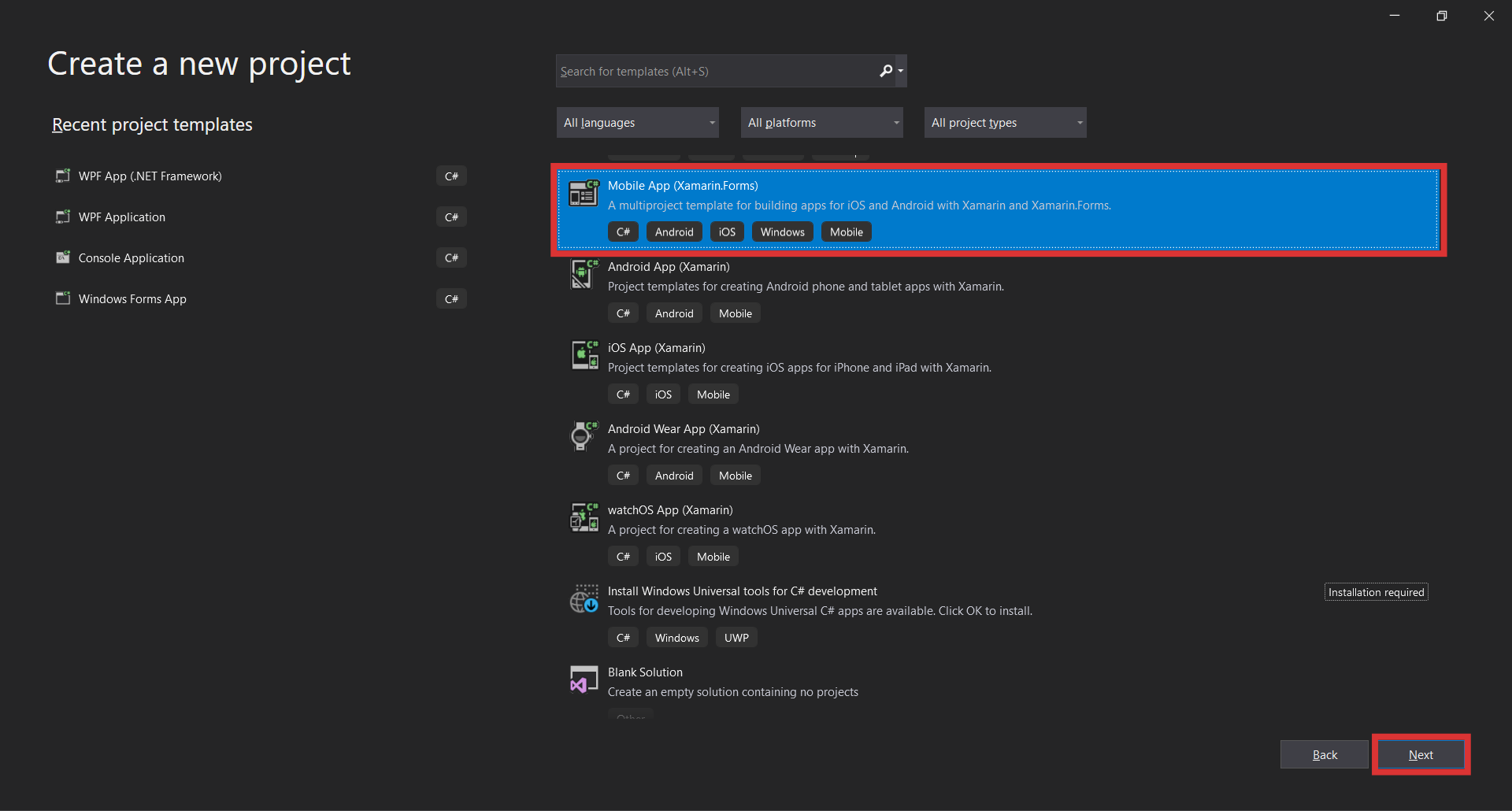 1. Buka Microsoft Visual Studio dan buat project baru dengan Mobile App(Xamarin.Forms) sebagai templatenya